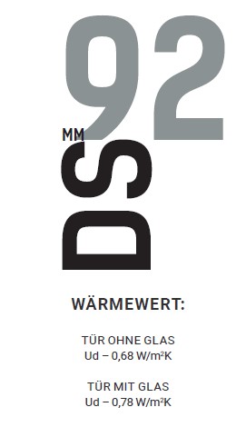 • Wärmewerte: Tür ohne Glas Ud – 0,68 W/m2K | Tür mit Glas: Ud – 0,78 W/m2K
