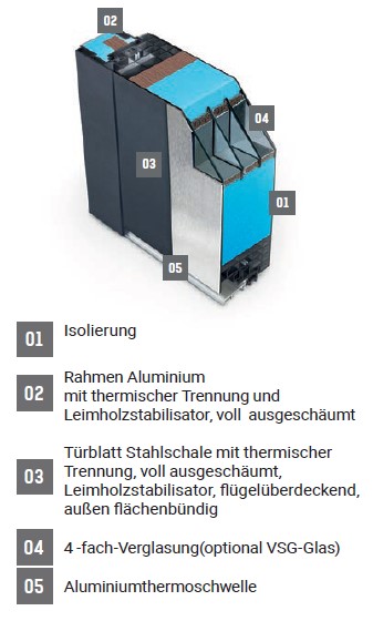 • Blatt: 92 mm starkes Türblatt Stahlschale mit thermischer Trennung, voll