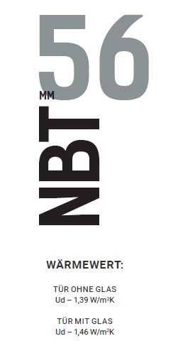 • Wärmewerte: Tür ohne Glas Ud – 1,39 W/m2K | Tür mit Glas: Ud – 1,46 W/m2K